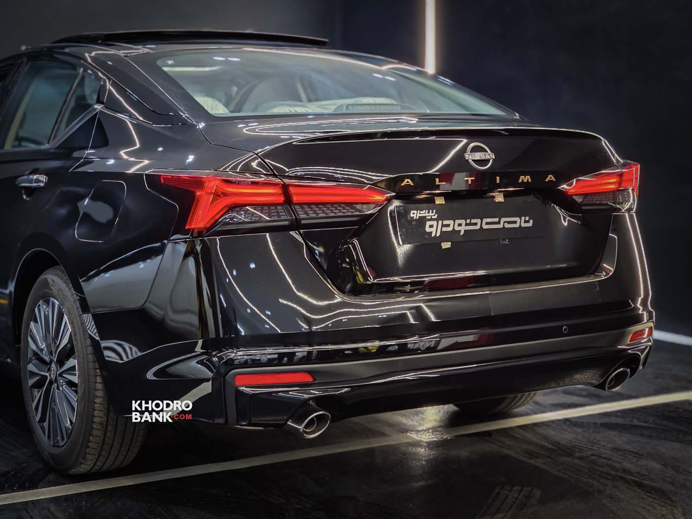 • نمای عقب: طراحی بخش عقب، اسپرتترین جنبه ظاهری آلتیما است. چراغهای افقی و کشیده، عرض خودرو را بیشتر نشان میدهند و گرافیک داخلی آنها با نمای جلو هماهنگ است. یک دیفیوزر ساده در بخش پایینی سپر به همراه دو خروجی اگزوز کرومی، چاشنی اسپرت لازم را به این بخش اضافه کرده و نشان میدهد که آلتیما صرفاً یک سدان خانوادگی آرام نیست.
